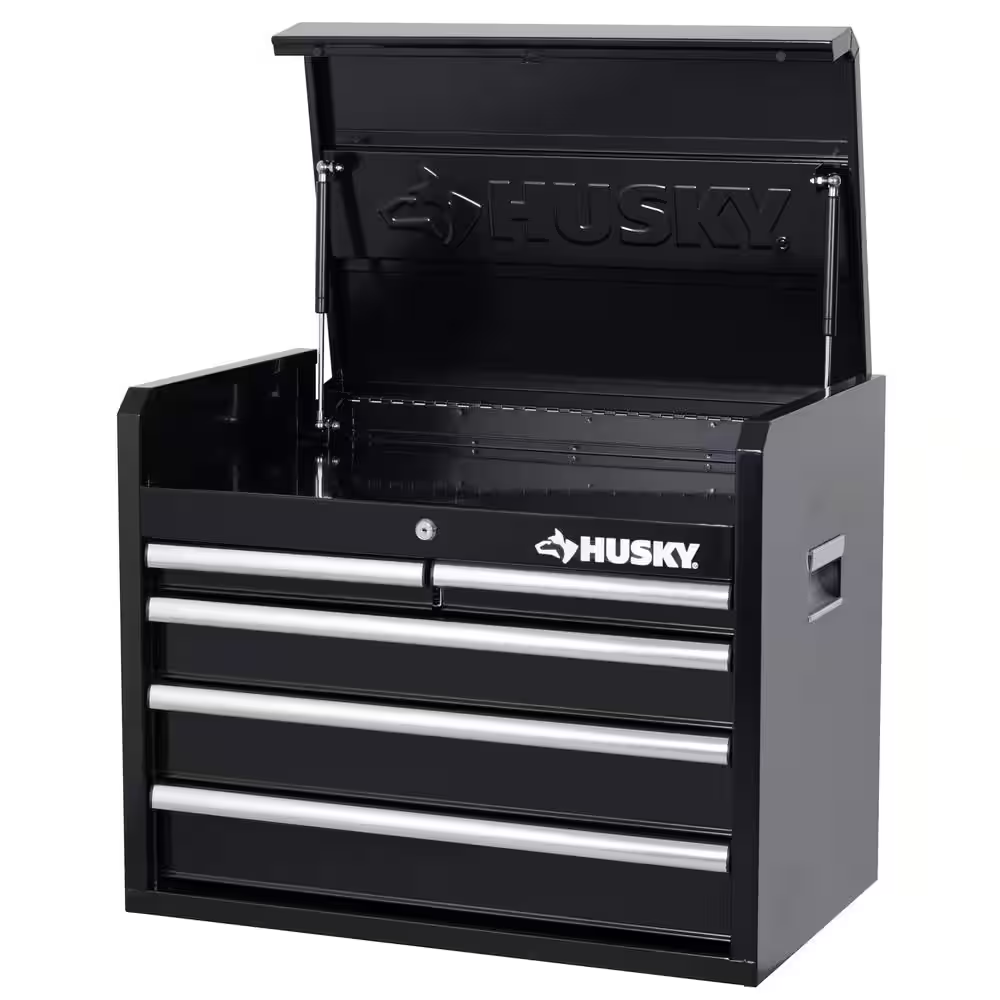 Make the best use of your garage with the efficiently designed Husky 26 in. 5-Drawer Tool Chest in Textured Black. Great for holding heavy equipment, this tool chest is built with an all-welded steel construction to offer increased durability. This tool chest has a textured powder coat paint finish that features rust-resistant properties, which adds a protective layer to your unit to ensure your hardware remains secure when not in use. It has a 25.9 in. W x 15.7 in. D x 2.5 in. H lid that features gas struts, providing improved safety when opening and closing. It features 5-drawers – 2 small, 2 medium and 1 large and features a total holding capacity of 5,113 cu. in., offering plenty of storage for all your equipment. Perfect for effortless closing and opening, this Husky high-quality tool chest is made with soft-closing ball bearing slides that can hold up to 100 lbs. to handle heavy loads. This high-quality tool chest is made with an internal locking system with 2 keys, designed to offer you peace of mind. Designed to occupy less space, it features 2 recessed handles, so you can place it in any corner of your workshop. Stay organized on every job with the Husky 26 in. 5-Drawer Tool Chest in Textured Black.