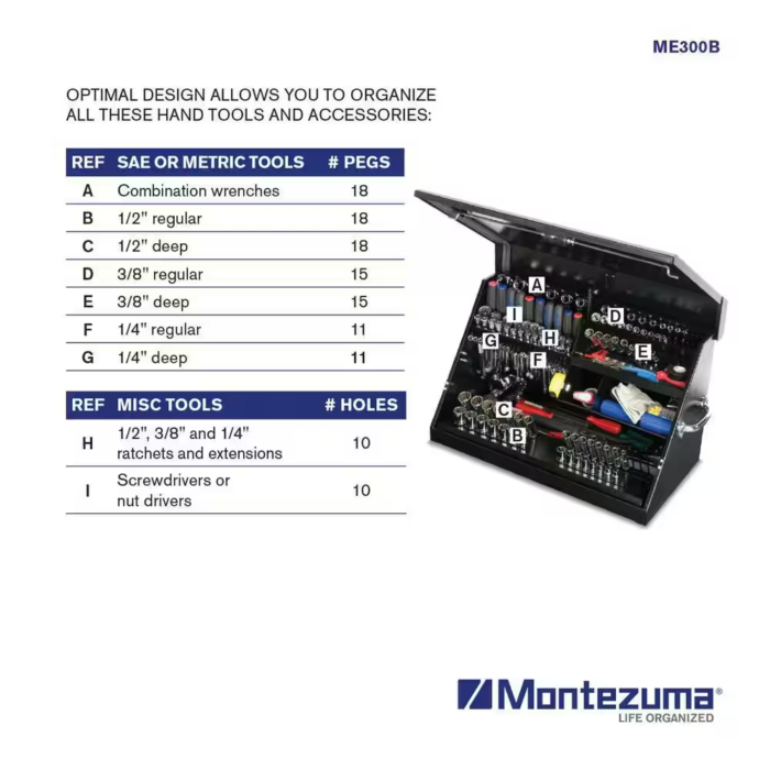 Portable Toolbox by Montezuma heavy-duty steel construction with welded seams, no spot welding, offers the best in rugged tool storage. Double side handles allow an easy transition from stationary to mobile as the lid secures tools in position when closed. Designated spaces for both metric and SAE tools, this box offers the best in storage for home and professional environments.