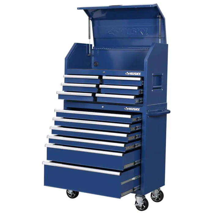 This Husky 36 in. 12-Drawer Tool Chest and Cabinet Combo in Blue is great for storing and organizing all your tools and hardware. The chest is made from high grade all welded steel construction and finished with tough industrial red powder coat paint. 12-Drawers and easily accessible top till provide a total of 21,471 cu. in. storage capacity. Drawers are all full-extension and glide effortlessly on soft-closing ball-bearing slides that can support up to 100 lbs. Top till has an integrated power strip with 6 outlets and 2 USB ports. Drawer Liners included to protect your tools and drawers. The reinforced top lid is supported by gas struts which make it easier to open and close. An ergonomic handle and 5 in. x 2 in. casters allow you to easily move your cabinet around your workspace. Total weight capacity of the cabinet is 1,200 lbs. Both the chest and cabinet have an internal keyed locking system, with 2 keys provided, for added security.
