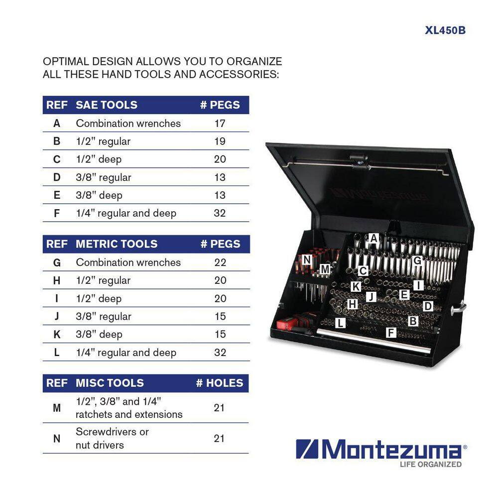 Portable Toolbox by Montezuma heavy-duty steel construction with welded seams, no spot welding, offers the best in rugged tool storage. Double side handles allow an easy transition from stationary to mobile as the lid secures tools in position when closed. Designated spaces for both metric and SAE tools, this box offers the best in storage for home and professional environments.