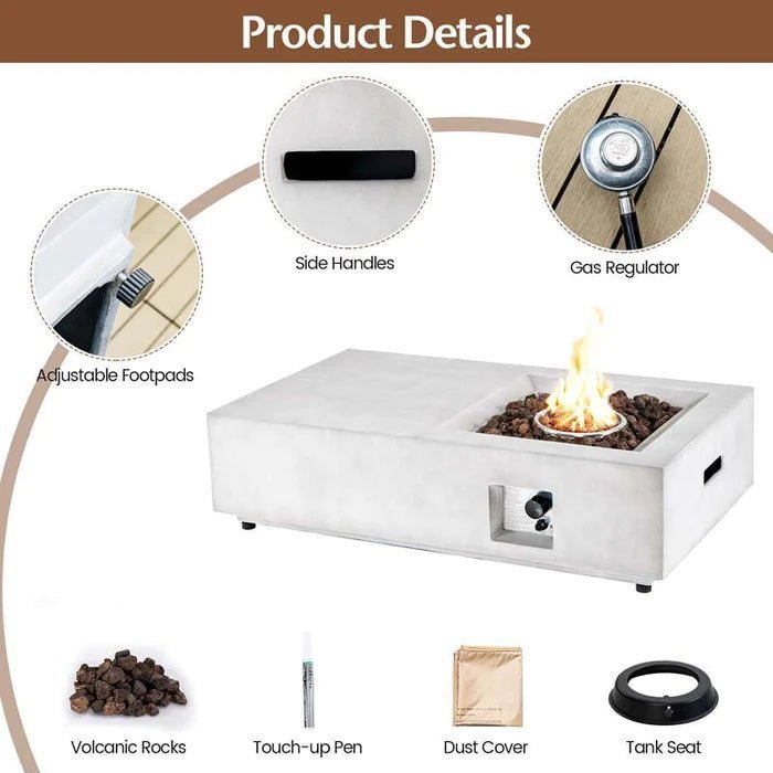 - Only for Outdoor Use: The fire pit table can be used only for outdoor occasions. Its concrete-like appearance fits well in different places like the backyard, poolside, garden and deck. In addition, the fire pit is fully assembled so there is no installation required. And the ignition steps are quite simple: push and turn the control knob, and continue pressing the igniter button to light the burner.