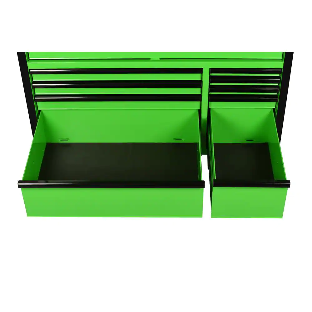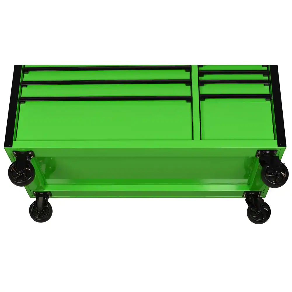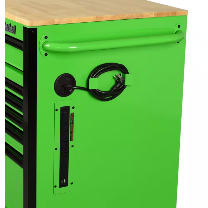The Husky 52 in. W x 24.5 in. D 10-Drawer Green Mobile Workbench with Solid Wood Top is here. This workbench is constructed of 20-Gauge steel and has a large wood surface for all your projects. The 10-drawers combine for 22,616 cu. in. of storage space. All drawers glide effortlessly on 100 lbs. rated ball-bearing slides. These slides are also equipped with a soft-closing mechanism that prevents your drawers from slamming shut. Each drawer also has a pre-cut liner inside to help keep your tools in place. On the side of the workbench is an integrated power strip that has 6 outlets and 2 USB ports. Storage hooks are available when cord is not in use. Finally, there are 5 in. x 2 in. casters and a push handle that will allow you to move the workbench around your work space with ease.