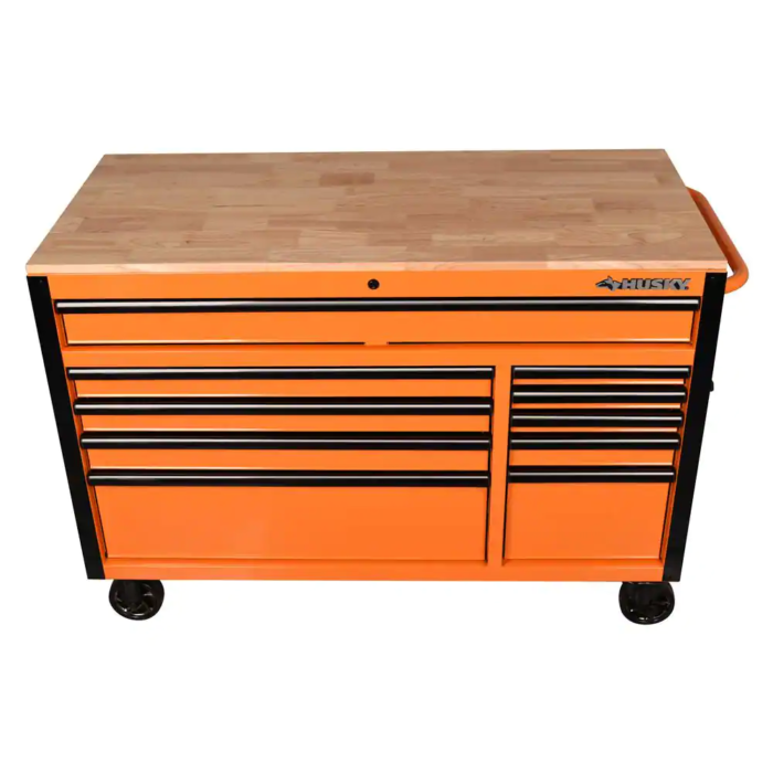 The Husky 52 in. W x 24.5 in. D 10-Drawer Orange Mobile Workbench with Solid Wood Top is here. This workbench is constructed of 21-Gauge steel and has a large wood surface for all your projects. The 10-drawers combine for 22,616 cu. in. of storage space. All drawers glide effortlessly on 100 lbs. rated ball-bearing slides. These slides are also equipped with a soft-closing mechanism that prevents your drawers from slamming shut. Each drawer also has a pre-cut liner inside to help keep your tools in place. On the side of the workbench is an integrated power strip that has 6 outlets and 2 USB ports. Storage hooks are available when cord is not in use. Finally, there are 5 in. x 2 in. casters and a push handle that will allow you to move the workbench around your work space with ease.