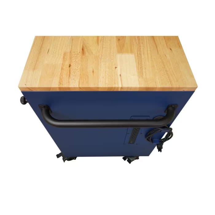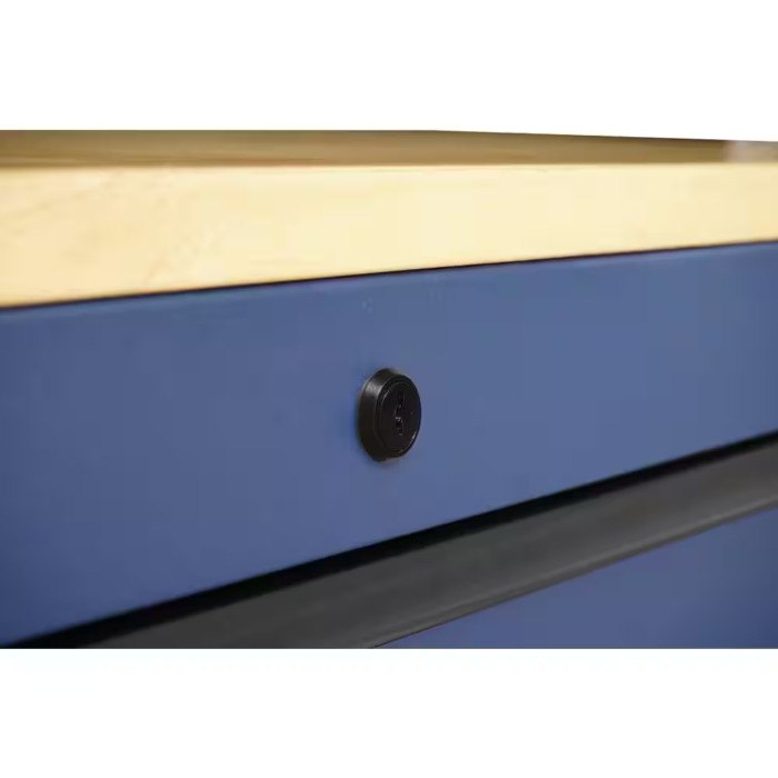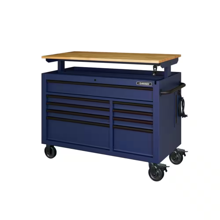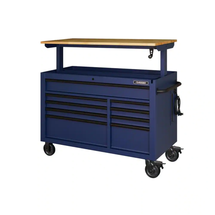 The innovative design of the husky 52 in. 9-drawer mobile workbench with adjustable-height top allows for a better ergonomic stance position, which helps reduce strain on your body and joints. The workbench doubles as a tool storage cabinet and a functional workstation. The rolling tool cabinet has heavier 19-Gauge steel. The 1 in. thick, solid wood top is coated with polyurethane for added utility and durability. Charge your power tools with the built-in, 4-outlet, 2 USB power center. The 120 lbs. rated, drawer slides keep the drawers from accidentally opening or slamming shut. Drawer liners are included to protect and keep your tools in place. The top long-drawer as well as the 2 deep bottom drawers have increased weight capacity limits of 200 lbs. each, with double 120 lbs. drawer slides. For added security, this unit is fitted with a key and lock system. This mobile work center has 4 large, 6 in. x 2 in. casters and a steel tubular side handle. The workbench has a revolutionary feature allowing you to adjust the height of the solid wood work surface according to your needs. A removable crank handle raises and lowers the top anywhere between 39 in. to 52 in. above the floor. It is also 24.5 in. D which is 6.5 in D than most standard rolling tool cabinets. It supports up to 3,000 lbs. and has 20,527 cu. in. capacity. Raise your work to a whole new level with this innovative tool storage system and bench.