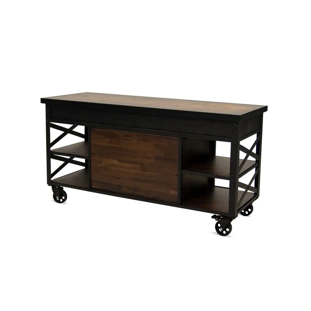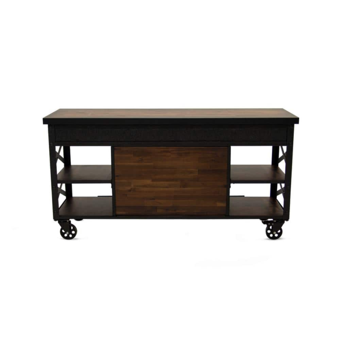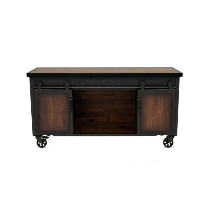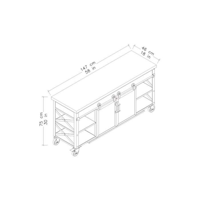 An industrial inspired and uniquely designed farmhouse cabinet equipped with sliding doors. Manufactured in metal and wood, the robust cabinet will blend into any decor effortlessly. Shipped fully assembled (only the door fronts and wheels need to be added) enables you to unpack the unit and start using it immediately without the hassle of assembly. Using quality and durable materials, the unit is perfect as a buffet or TV stand and provides functionality as you can use it to store and display items.