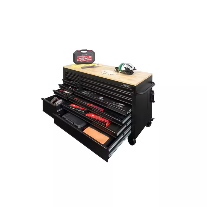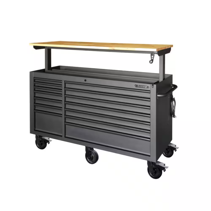 Raise your work to a whole new level with the innovative Husky 62 in. 14-Drawer Mobile Workbench with Adjustable-Height Top. The workbench has a revolutionary feature that allows you to adjust the height of the solid wood work surface according to your needs. A removable crank handle raises and lowers the top anywhere between 39 in. to 52 in. above the floor. This innovative design allows a better ergonomic standing position, which is known to help reduce strain on your body and joints. This mobile workbench is the perfect combination of a tool storage cabinet and a functional workstation. This rolling tool cabinet has heavier 19-Gauge steel. This workbench is 24 in. deep, which is 6 in. deeper than most standard rolling tool cabinets and supports up to 2,500 lbs. and has 31,721 cu. in. capacity. The 1.2 in. thick, solid wood top is coated with polyurethane for added utility and durability. Charge your power tools with the built-in, 6-outlet, 2 USB power center. The 120 lbs. rated, soft-close drawer slides keep the drawers from accidentally opening or from slamming shut. Drawer liners are included to protect and keep your tools in place. The two deep bottom drawers have increased weight capacity limits of 240 lbs. each, with double 120 lb. soft closing drawer slides. For added security, this unit is fitted with a key and lock system. This mobile work center has 6 large, 6 in. x 2 in. all swivel casters and a steel tubular side handle.