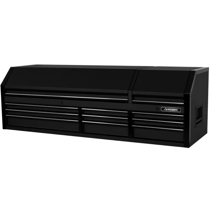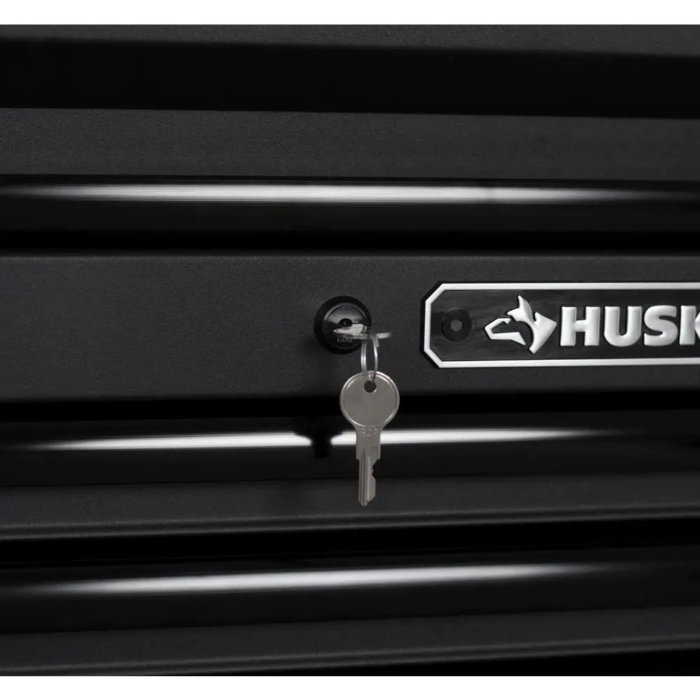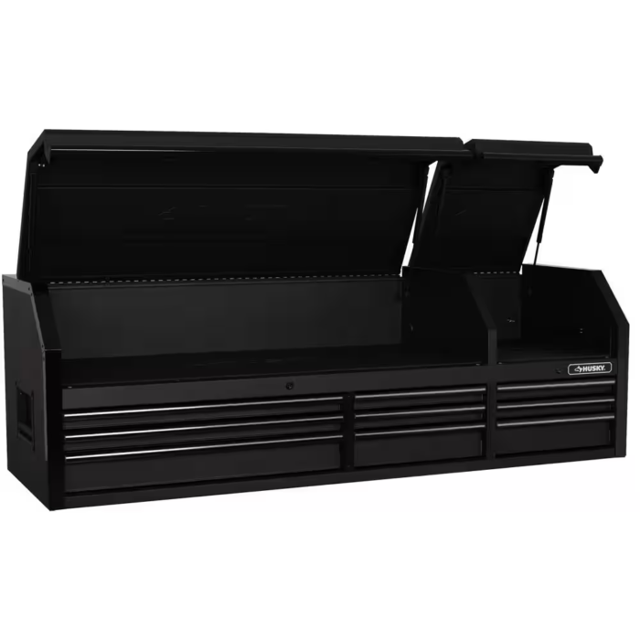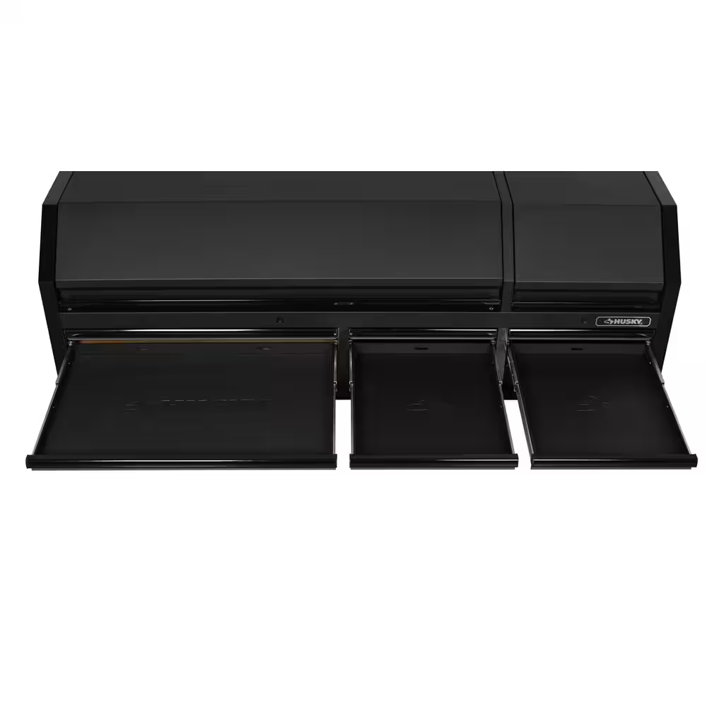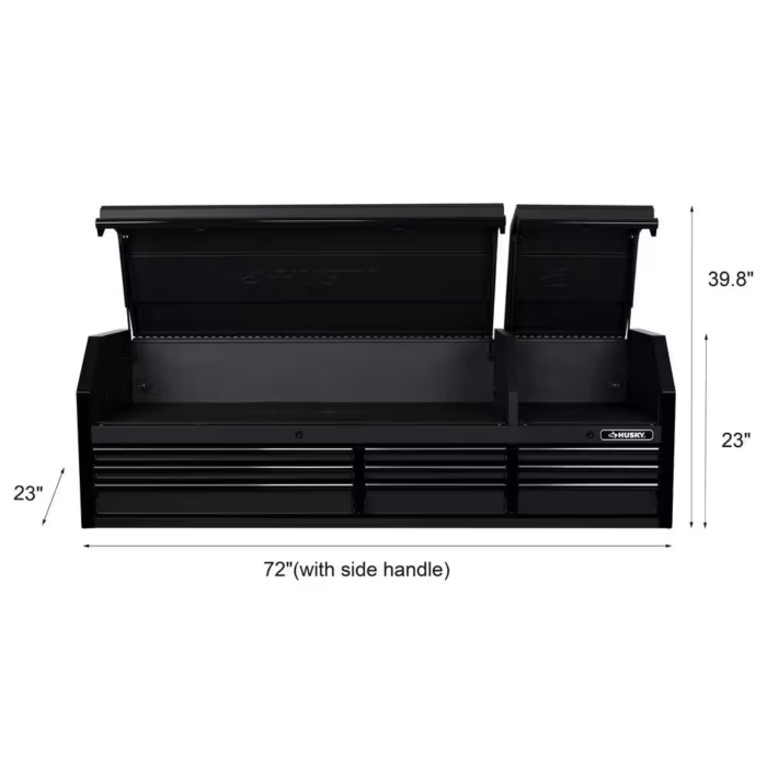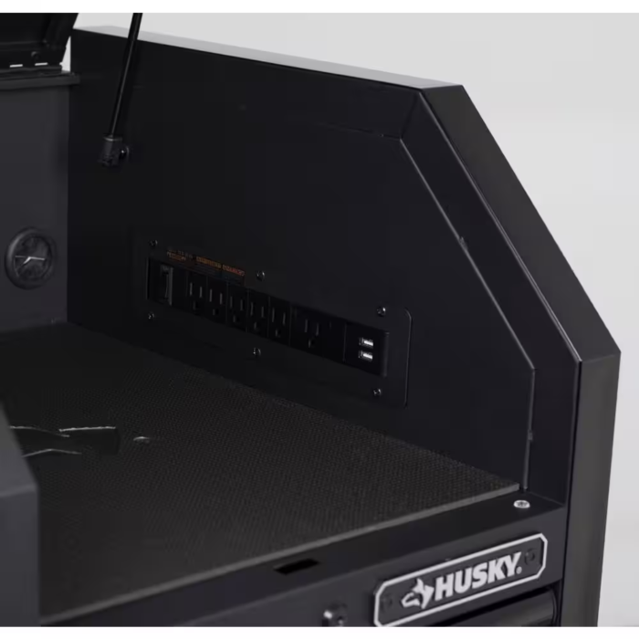 The Husky Heavy-Duty 72 in. W x 23.0 in. D 9-Drawer Tool Chest creates additional storage options for the 72 in. Workbenches (sold separately). The chest is built to last with all-welded 19-Gauge steel construction and is finished with a tough, industrial textured black powder-coat finish, and connecting brackets are included to securely attach the chest to the workbench. This chest has a unique design that has 2 separate sections that can be locked independently of each other. All drawers are full-extension ball bearing slides that can support up to 120 lbs. These slides also have a soft-close retention system that pulls drawers closed and ensures that they are secured. The reinforced top lid is supported by gas struts, which make it easier to open and close. Another feature in this chest is the pull-out wooden work surface in the lower left-hand drawer. This drawer will lock into place with ball detents when fully extended to create a nice 30 in. W work space or place to put a laptop. The wood top is also hinged so you can lift it up to access the drawer for store tools and supplies. Also, inside the lid storage area are 2 integrated power strips, each with 6 electrical outlets and 2 USB ports that allow you to securely charge tools and portable devices.