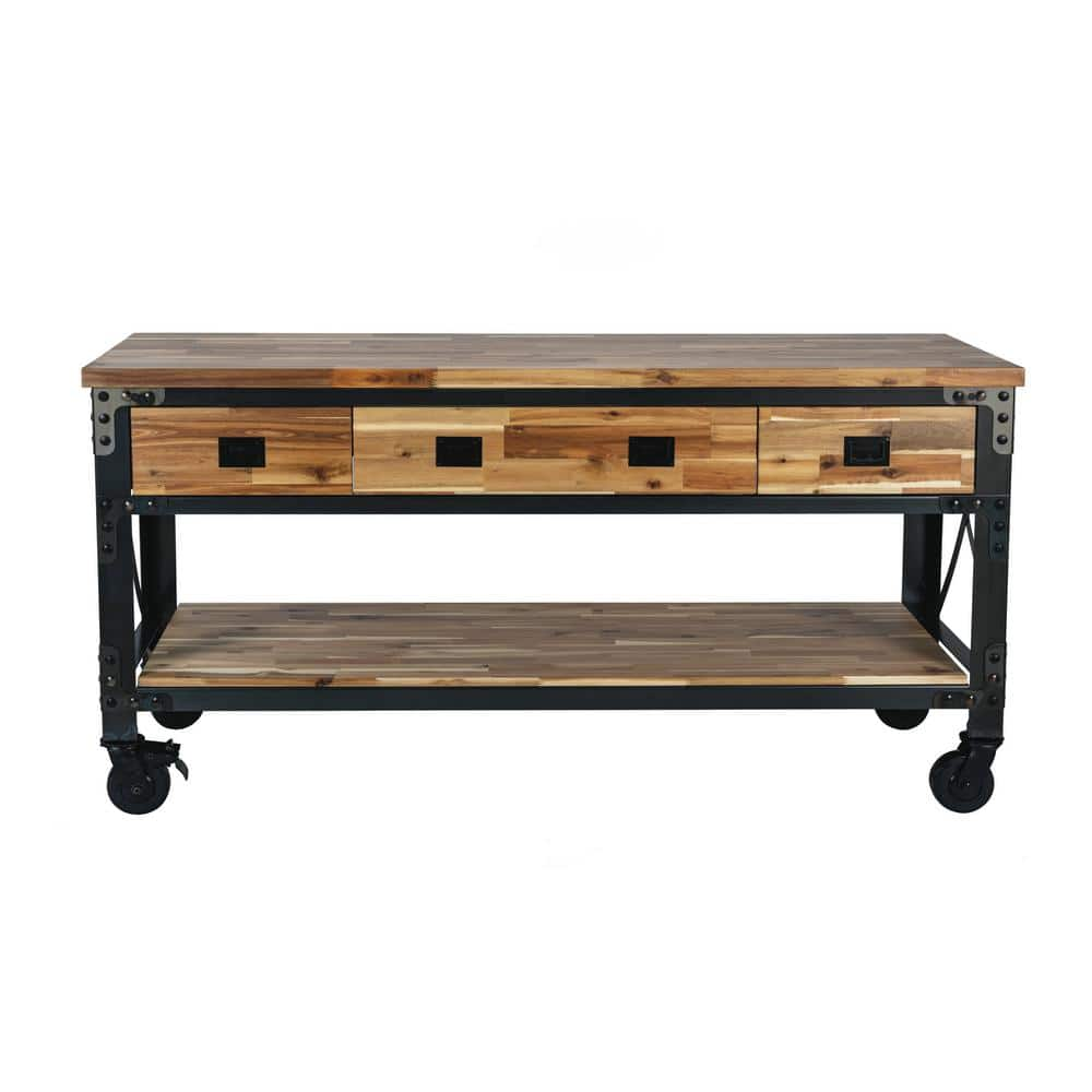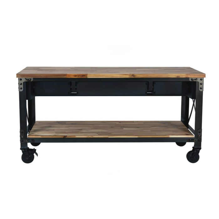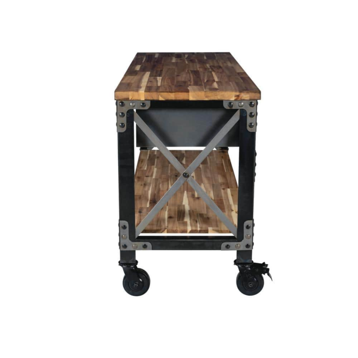If you are searching for a truly inspired industrial product for your home, then Darby is what you are looking for. With its deeply distressed patina and contrasting colors, it is a piece of furniture that truly depicts industrial style. Ideal for food prepping, at 37″ high it is more than just a kitchen island, it can also be used as a buffet, bar, desk or console. Strong and sturdy, the frame is made of steel and comes with a solid wood natural finish acacia top that provides a large work surface. The 3 drawers and lower wood shelf provide additional storage space.