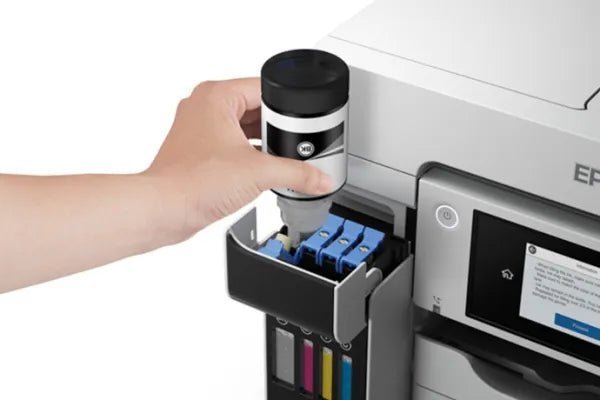 - EcoTank technology eliminates the need for cartridges and permits filling with replacement bottles, providing users with more affordable ink and the ability to print up to 7500 black pages and 6000 color pages per tank