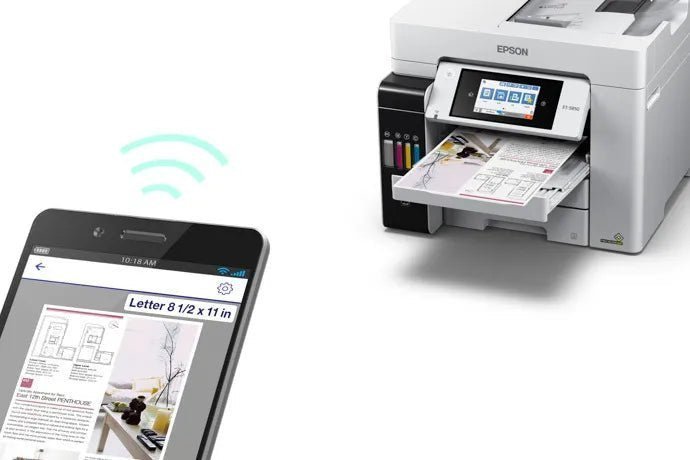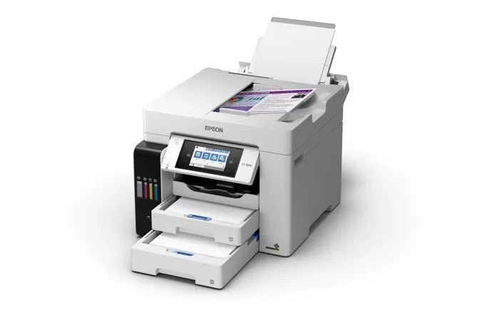 Two 250-sheet input trays work with documents up to 8.5 x 14″, and a long-document mode on the rear feed enables the production of media up to 8.5 x 47.2″. For scanning and copying, the unit has an 8.5 x 11.7″ flatbed scanner that allows scans up to 8.5 x 14″ with the ADF, and optical scan resolution is an impressive 1200 dpi. Settings can be checked and quickly changed via the 4.3″ color touchscreen, and for maximum versatility during setup, the ET-5850 is equipped with USB 2.0, Ethernet, and Wi-Fi connectivity. Additionally, mobile printing is made possible via Apple AirPrint, Mopria, Epson Connect Email Print, and the Epson iPrint Mobile App.