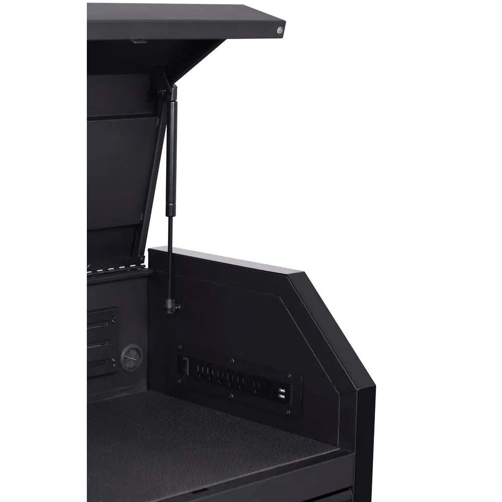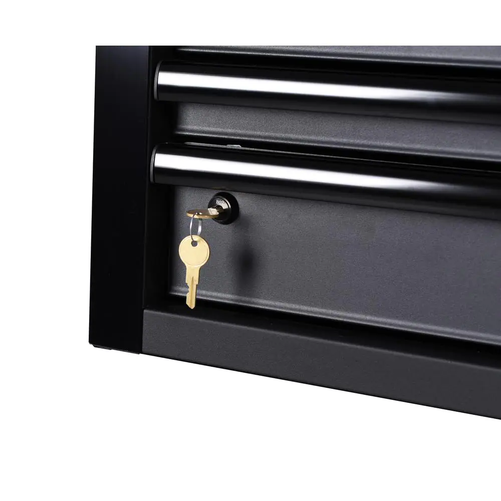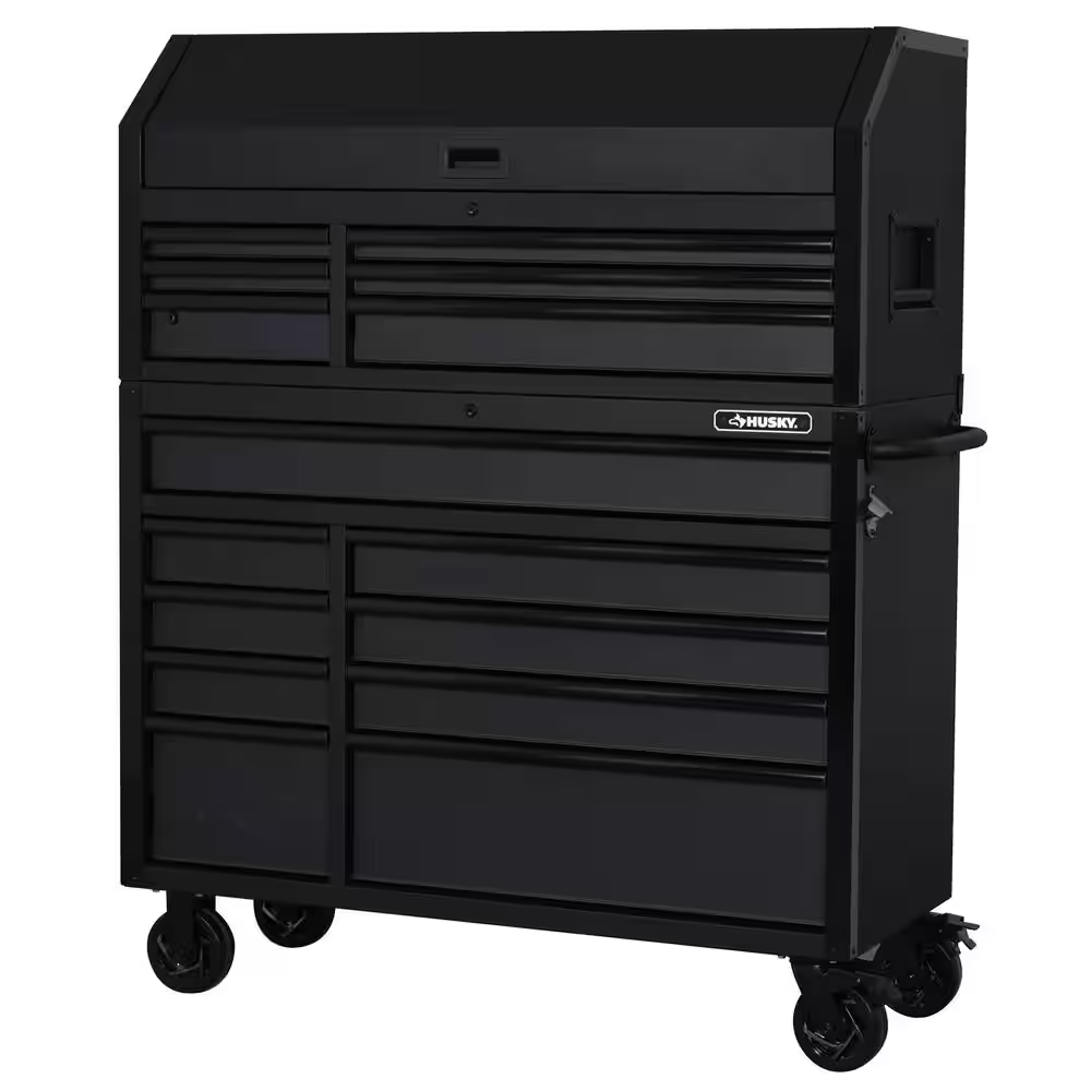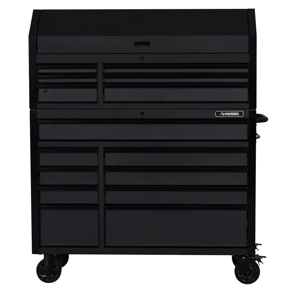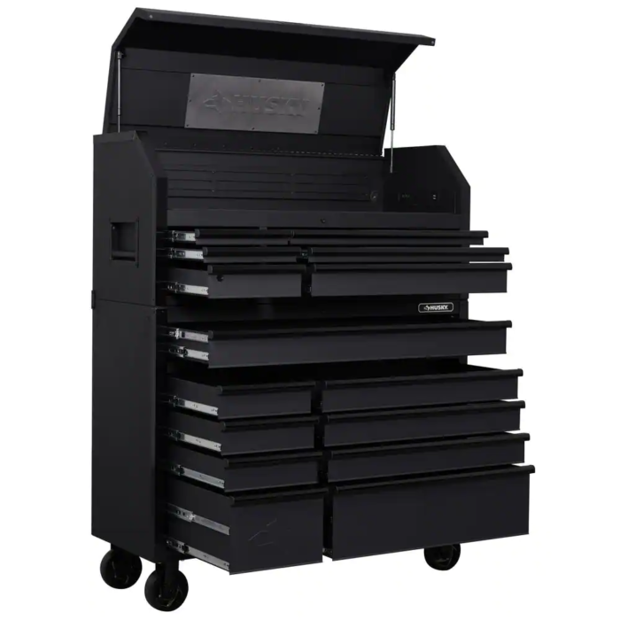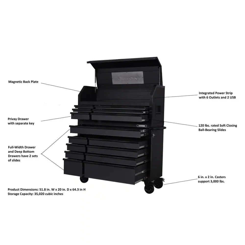 The latest generation of the Husky Industrial 52 in. W x 20 in. D 6-Drawer Tool Chest has arrived. The chest is built to last with all-welded 19-Gauge steel construction and is finished with a tough, industrial textured black powder-coat finish. All drawers are full-extension and glide on ball bearing slides that can support up to 120 lbs. These slides also have a soft-close retention system that pulls drawers closed and ensures that they are secured. An additional set of slides has been added to the full-width drawer and bottom deep drawers to accommodate heavier loads. The reinforced top lid is supported by gas struts, which make it easier to open and close, while the back of the top till has a large magnetic plate that provides storage and quick access to frequently used tools. Also, inside the lid are 6 electrical outlets and 2 USB ports that allow you to securely charge tools and portable devices while unit is locked. The casters have been upgraded to an even heavier-duty 6 in. x 2 in. size, and moving the cabinet around your workplace is easy with the ergonomic tubular handle.