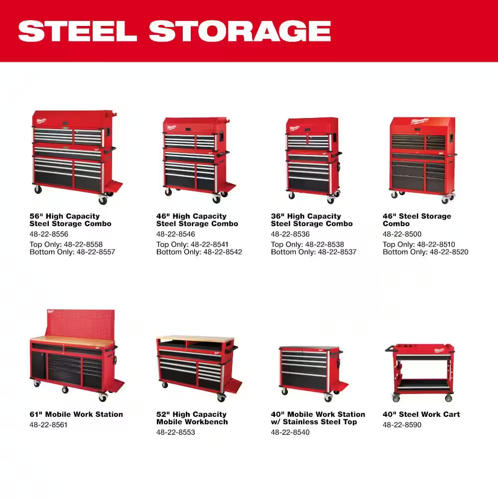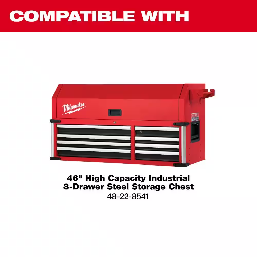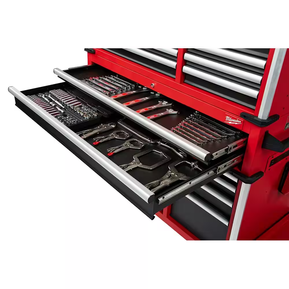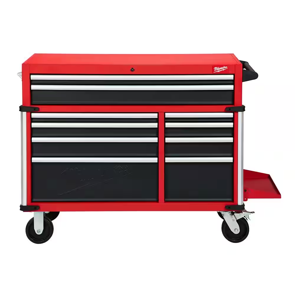 Loaded with the extra features you want, the Milwaukee 46 in. 10-Drawer tool cabinet boasts a massive 19,440 cu. in. of storage capacity and can hold over 2,500 lbs. The 10-drawer cabinet is an extra-deep 22 in., which is 4 in. deeper than most other units. The extensive list of features includes a long tool holder, folding side shelf, bottle opener, and stylish aluminum edge guards with rubber corner bumpers to help protect your investment. The 100 lbs. rated, soft-close, ball bearing drawer slides gently retain the drawers from accidental opening or slamming shut. The rolling cabinet features 2 full-width, top drawers to provide storage for all your long tools and pry bars. Mount your Milwaukee battery chargers to the side wall and charge your batteries with the built-in, 6-outlet/2USB power center. The 9.5 in. D bottom cabinet drawers offer additional organizational options with a removable power tool organizer for easy management of your power tools and battery packs. The red and black textured finish is rugged, durable, and stands up to harsh environments. This tool storage cabinet has it all.