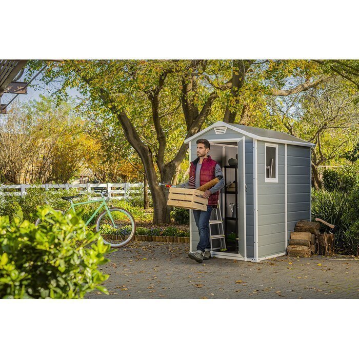 This storage shed makes your garden and garage clutter-free and provides the perfect storage space for all your needs. This shed is a practical addition to your home and keeps your tools and essentials well-organized. The shed is made from premium quality material that offers long-lasting performance. The sturdy gable design provides excellent durability and lends a traditional touch to the outdoor decor. The gray and white enhance its overall appeal and complements most homes. It has one fixed window and an opening at the top for ventilation and better airflow to move the chemical smells. The storage unit is ideal for storing most tools and offers maximum storage in minimal space. This tool shed has one front panel door, which opens wide for better accessibility. The sturdy roof and floor offer versatile placement options. It is ideal for gardens, lawns, and backyards. The shed won’t rot, peel, or dent that retains its look for a longer time.