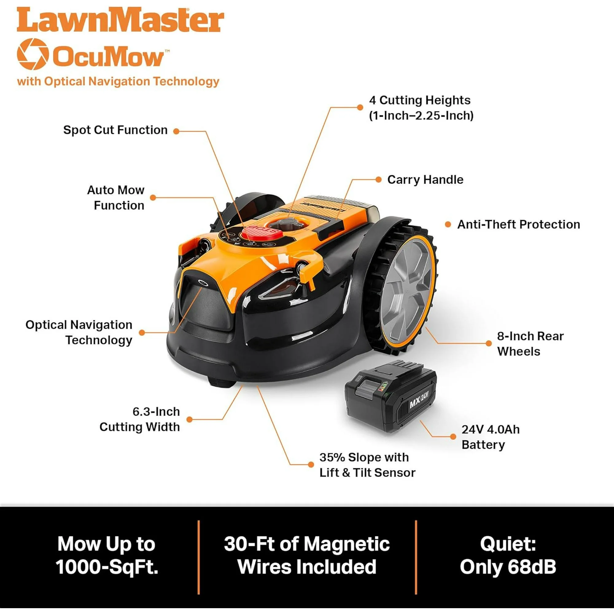 About this item OPTICAL NAVIGATION TECHNOLOGY: Take the guess work out of yard work. Our robot mower uses sensors and a wide angle, high dynamic range camera to identify grass even under extreme contrast lighting situations to allow the robot to navigate around your lawn efficiently. DESIGNED FOR SMALL LAWNS: Mow for up to 3 hours covering 2000 square feet while dropping small clippings on the lawn to feed the grass. For a larger yard, extra batteries can be purchased separately. OBSTACLE AVOIDANCE: Two ultrasonic sensors detect obstacles and automatically re-direct the robot mower to avoid obstacles as small as 6-inches NO GO FUNCTION: Use the included 30-feet of magnetic wires to create a virtual fence within your yard. Set up is easy with no power source or digging required and prevents the robot mower from entering any forbidden areas. CLIMB UP TO 35% (19°) SLOPE: Deep tread wheels and powerful drive system grips slopes to handle complex lawns DROP AND MOW: There is no need for an outdoor power socket or app setup. Simply set the robot mower on an appropriately sized lawn, push the start button, and let it get to work. FOR BEST RESULTS: A clearly defined edge around the full perimeter of your lawn is required to prevent the mower from leaving the grass. Adjustment of the lawn edges may be required. As with other robot mowers, a grass trimmer is needed to trim the lawn edges.
