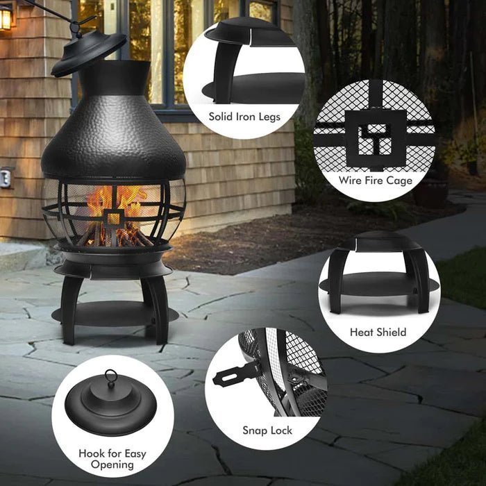 - Safe & Humanized Design: This chimenea diverts the smoke up and allows smoke to rise straight, creating a comfortable environment for guests. Besides, the cap protects the fire cage from rain and other elements. The premium fire poker lets you remove the cover or charcoal without hurt.