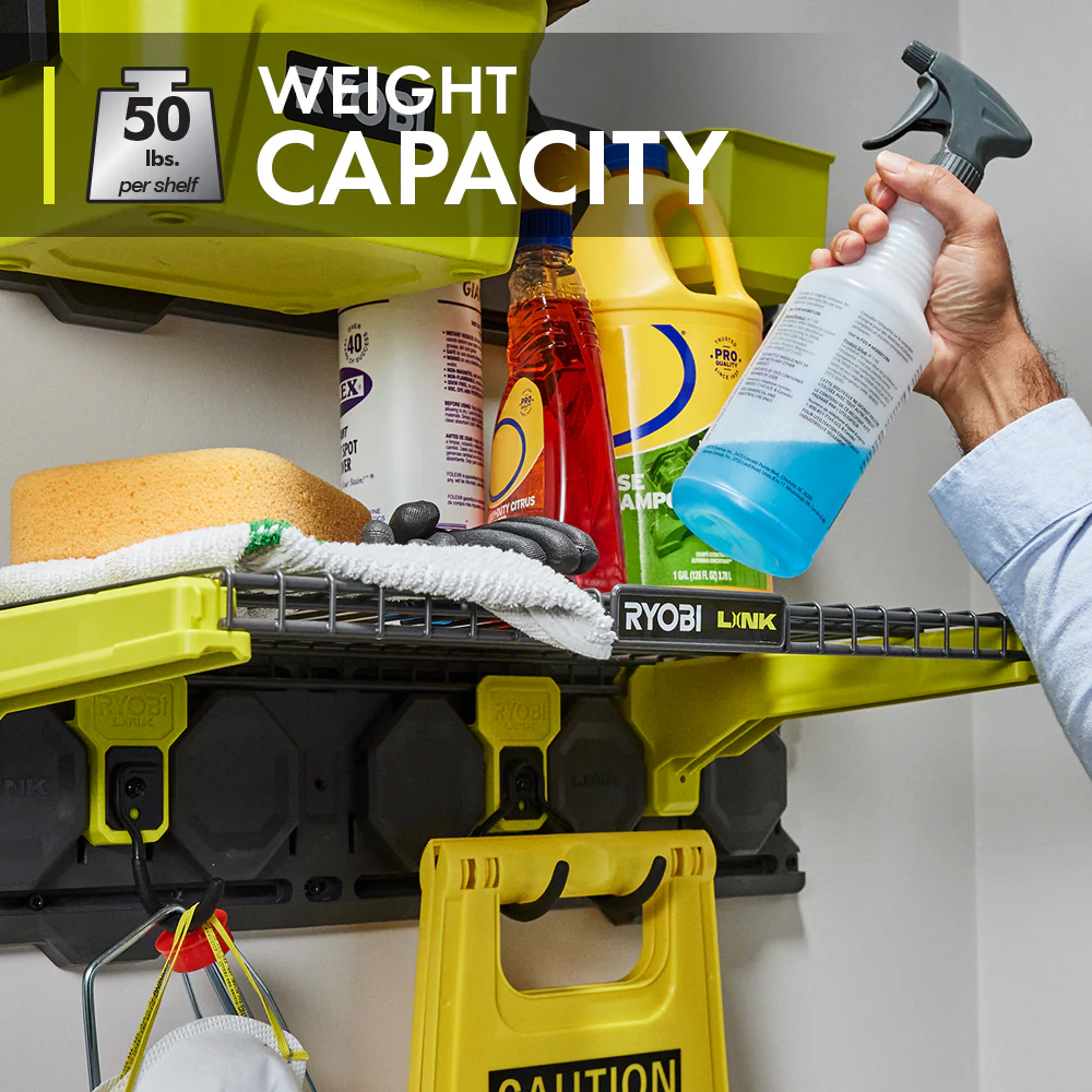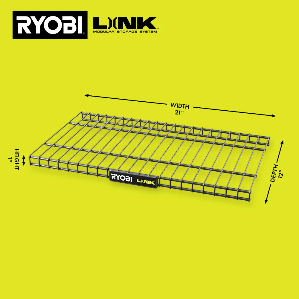 The RYOBI LINK Modular Storage System is revolutionizing the storage industry, enabling you to Organize, Access and Transport your life. The RYOBI LINK 21″ Wire Shelf is designed to be used with the LINK 2-in-1 Shelving Brackets. Use two 2-in-1 brackets to hold one shelf or add a third bracket to hold two shelves next to each other, sharing the middle bracket, providing 3.5′ of shelf space. Continue to expand your shelving system by adding one additional bracket and shelf in a row. Shelves are elevated on top of brackets to allow hooks to be placed on Wall Rail under shelf for additional storage. The wire form design provides additional ventilation, keeping all of your materials dry. Best of all, it is part of the RYOBI LINK Modular Storage System line of products that use the same locking technology to seamlessly connect your mobile and stationary storage needs. Own your space with RYOBI LINK Modular Storage System.