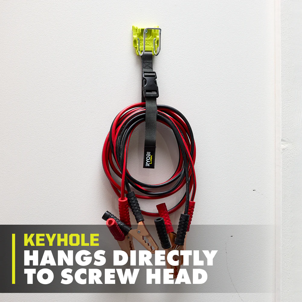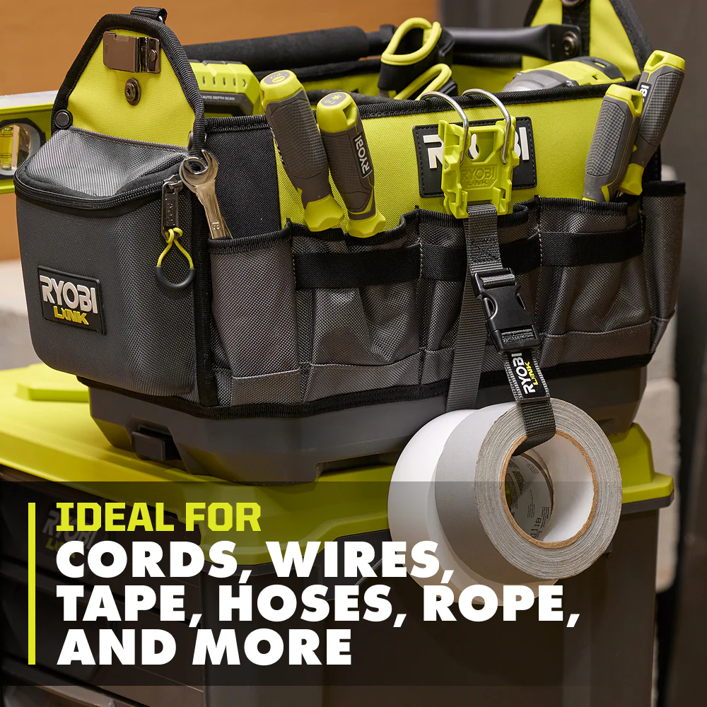 The RYOBI LINK Modular Storage System is revolutionizing the storage industry, enabling you to Organize, Access and Transport your life. The RYOBI LINK Quick-Hang Strap Hook offers four versatile hanging options, keeping cords, wires, tape, hoses, rope and more within reach. Designed for maximum convenience, its sturdy belt clip and wire hook attach effortlessly to belts, tool bags, 2-by lumber, ladders and more. Store on your LINK Wall Rail, or place it directly on a screw head. This strap-hook comes equipped with a buckle closure to quickly fasten your items. Use the integrated pull tab to cinch the strap, keeping your products and accessories secure. Best of all, it is part of the RYOBI LINK Modular Storage System line of products that use the same locking technology to seamlessly connect your mobile and stationary storage needs. Own your space with RYOBI LINK Modular Storage System.