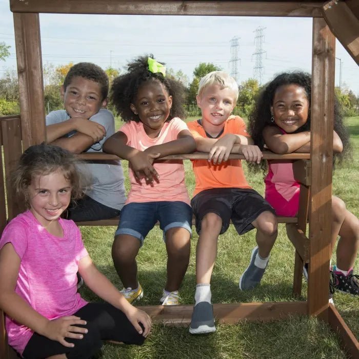 Create an instant play land with the Knightsbridge Deluxe Wood Complete Play Set by Swing-N-Slide. This backyard swing set features two swing seats with coated chains and a Wind Rider Glider, each designed to support up to 115 pounds. Designed to compliment any yard, this play set for kids features a durable wooden roof with decorative sunburst gable and two windows. Includes the Cool Wave Slide and the Alpine Wave Slide, each constructed from durable thermoformed plastic with a weight limit of 250 pounds. Two play deck heights include a climbing rock wall with plastic rock holds, ladder, picnic table and much more. All pre-cut, prestained lumber, hardware, and instructions are included. Build your dream swing set today!