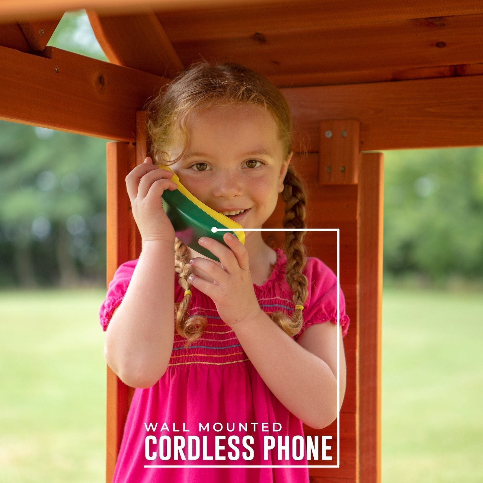A cheery half-door is perfect for mini greeters, thirsts can be quenched through the side snack window, and the front boasts adorable flower pot holders (blossoms sold separately). Inside, the fun sizzles with a play sink, stove, and cordless phone.