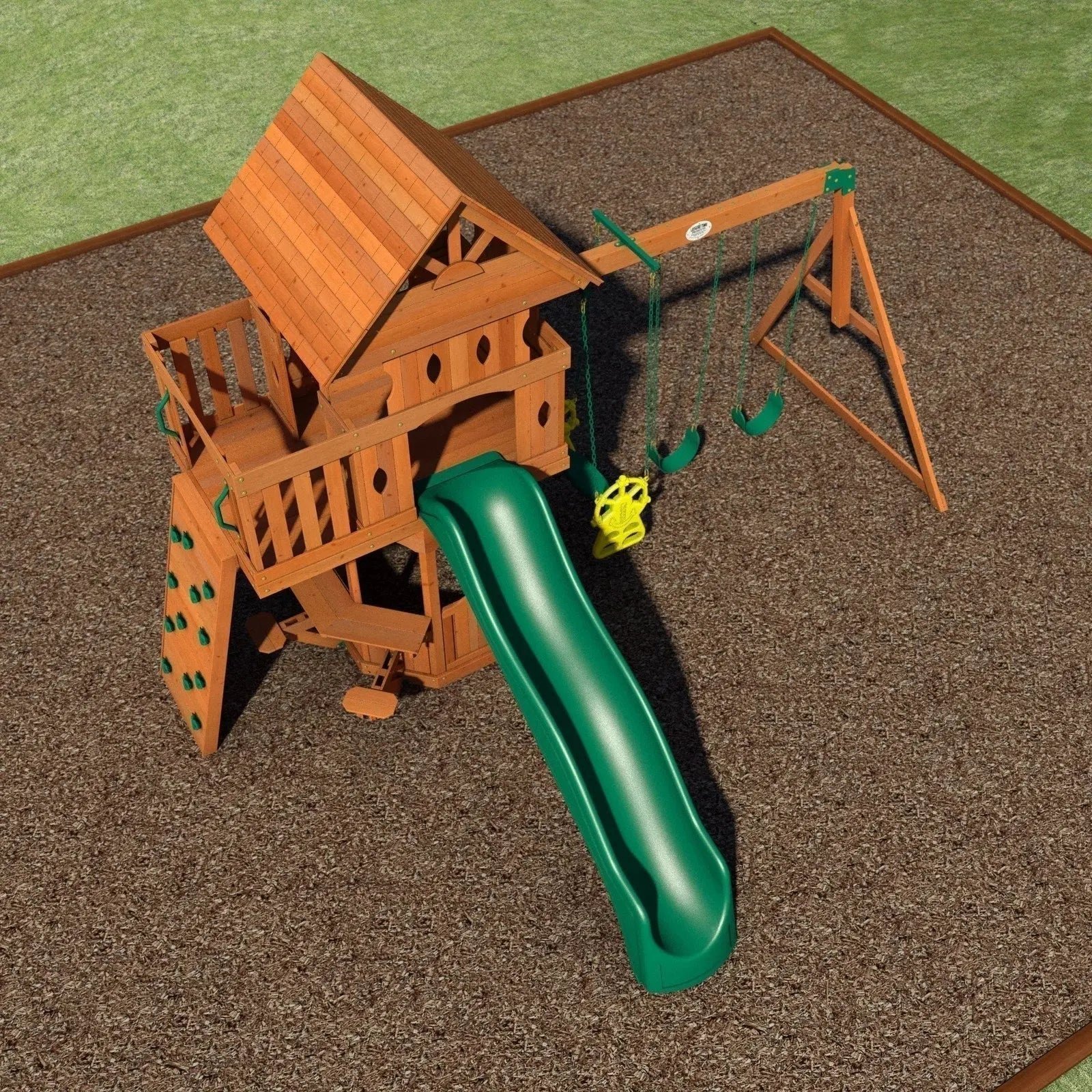With all the charm of a forest cottage, the Woodland set has all the elements for a fairy-tale adventure. Between the upper clubhouse with 360° views, expansive sun porch, and octagon-shaped lower fort, there’s plenty of room for your kids’ imaginations to run free. They can climb up the 5’ high rock wall or ladder in search of safe reprieve from the wild jungle creatures, and then swiftly slide down when it’s all clear. They can swing alone on a belt-swing or together on the two-seated glider as if veering on vines from treetop to treetop. And they can serve pretend porridge to three little bears at the snack bar below. This set will find your family years of forest fun!